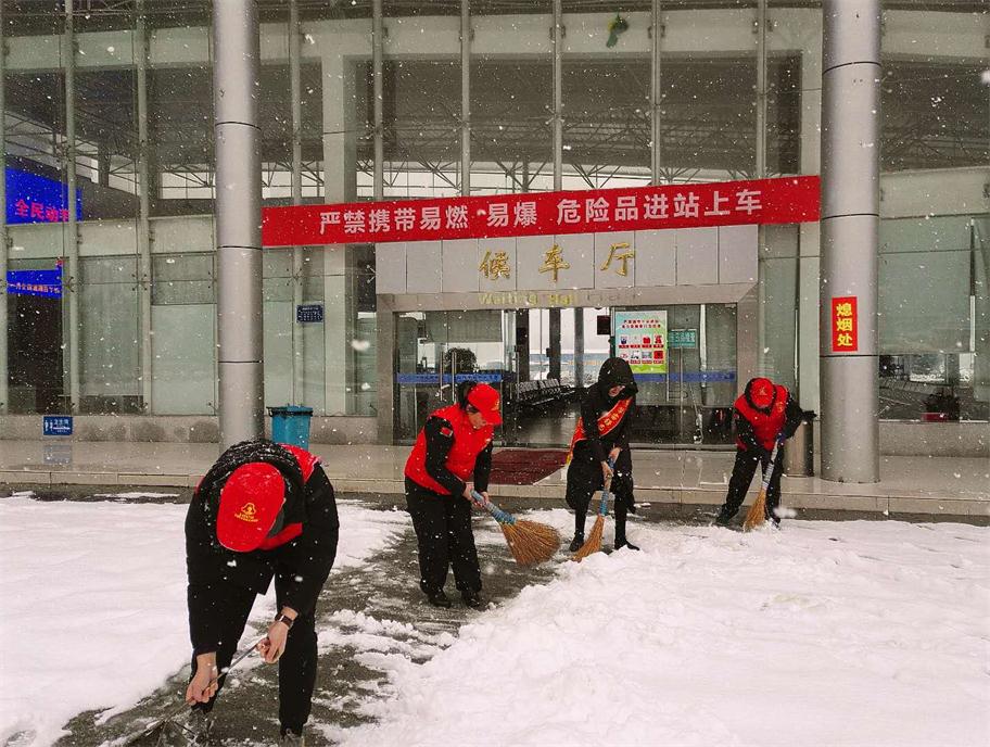 工作人員與志愿者一起清掃積雪,做好站場(chǎng)防滑措施(汽車南站)